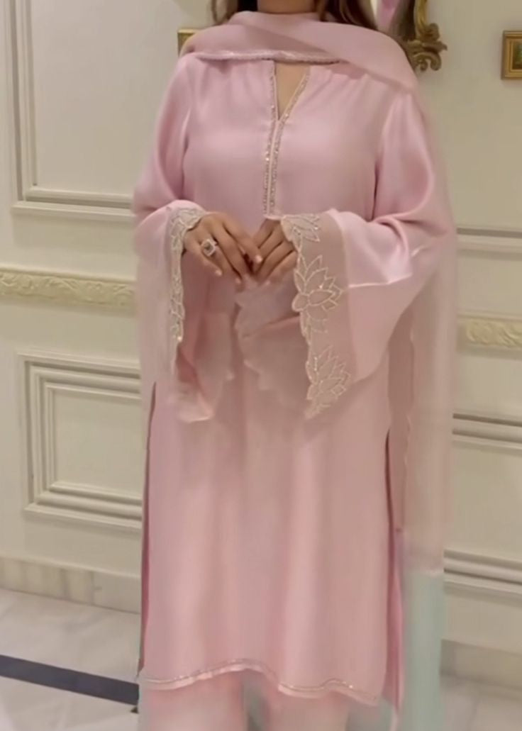 A refined 3-piece stitched silk suit featuring a graceful long shirt and straight silk trousers, paired with a fluid organza dupatta. Delicate stone-chain embellishment along the placket and sleeve hems adds a luminous, semi-formal finish—perfect for festive dinners, parties, and wedding events in Pakistan.