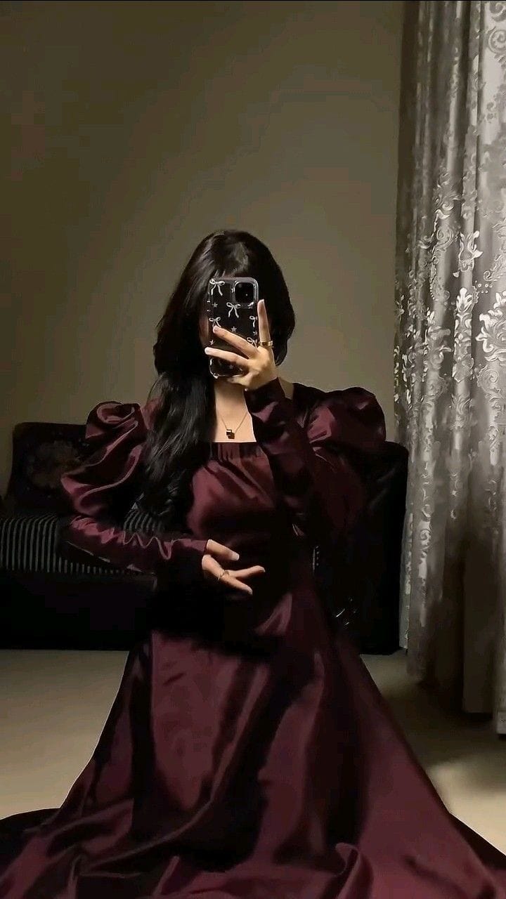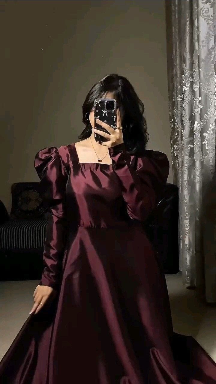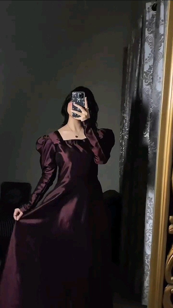 - Maxi Shirt: Long raw-silk silhouette with square neckline, structured puff sleeves, and graceful flare