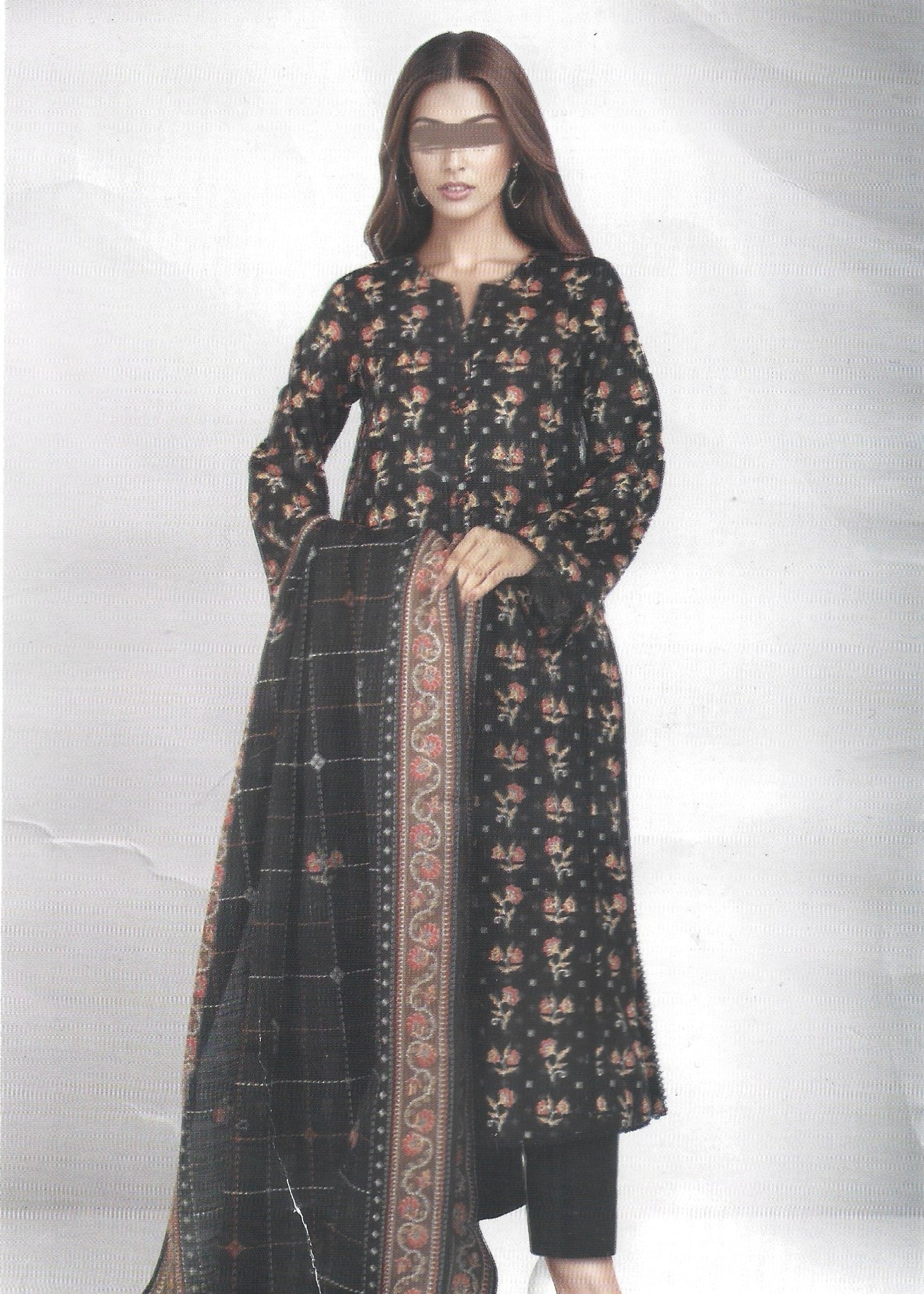 Stay timelessly elegant this winter with this black khaddar unstitched 3PC suit featuring a floral printed shirt, dyed trouser, and a matching printed dupatta. A graceful design perfect for day-to-evening wear.