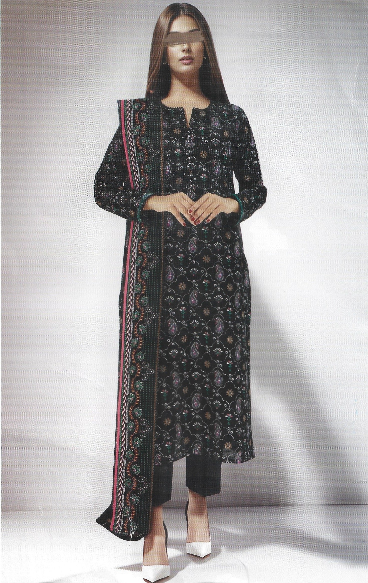 Step into effortless elegance with this premium khaddar unstitched 3PC suit, featuring a bold printed shirt, dyed trouser, and a statement printed dupatta. A perfect pick for cozy winter wear.